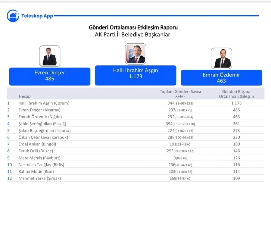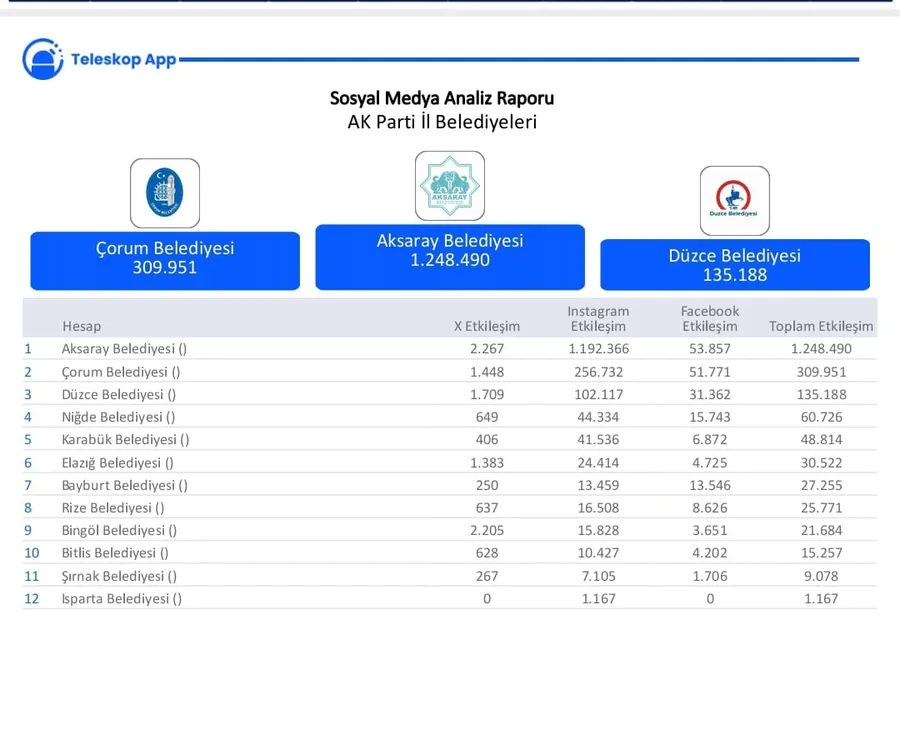 Yapılan ölçümlerde, Aksaray Belediyesi toplamda 1 milyon 248 bin 490 etkileşim alarak tüm AK Partili il belediyeleri arasında zirveye yerleşti. Belediye Başkanı Dr. Evren Dinçer ise gönderi başına aldığı 485 ortalama etkileşim ile en çok ilgi gören başkanlardan biri oldu.