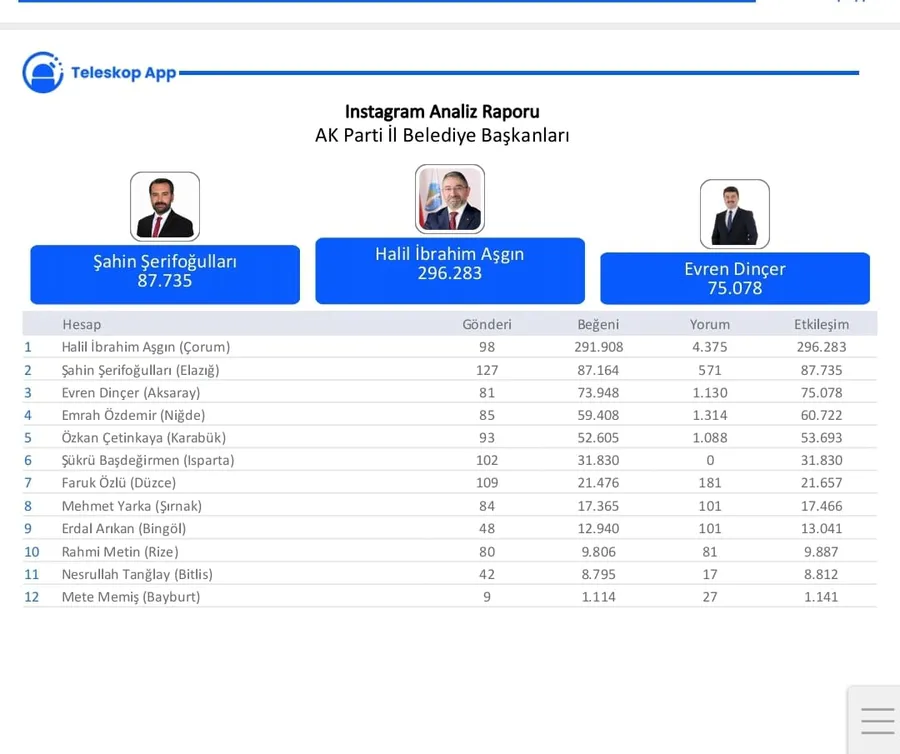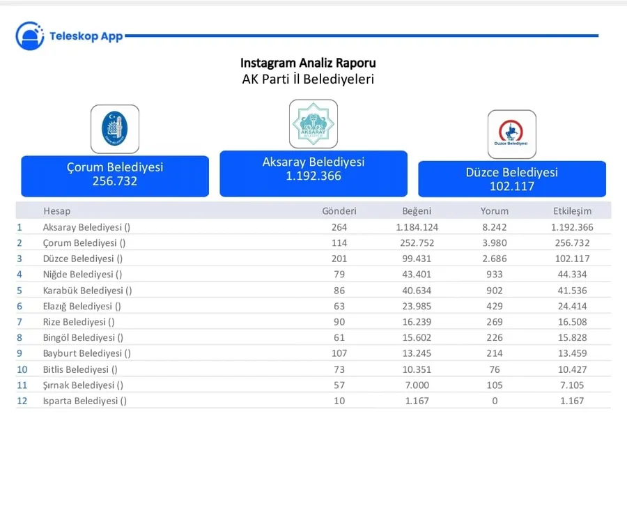 Rapora göre, Aksaray Belediyesi resmi sosyal medya hesapları toplamda 1 milyon 248 bin 490 etkileşim alarak tüm AK Partili il belediyeleri arasında birinci sıraya yerleşti. Belediye Başkanı Dr. Evren Dinçer ise gönderi başına aldığı 485 ortalama etkileşim ile en çok ilgi gören belediye başkanları arasında yer aldı.