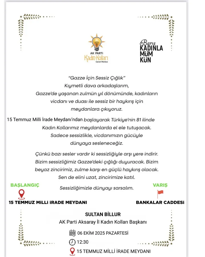 AK Parti Kadın Kolları’nın çağrısı, yalnızca Gazze’de yaşanan insanlık dramına dikkat çekmeyi değil, aynı zamanda kadınların vicdan sesiyle barışın dünyaya duyurulmasını da hedefliyor.
