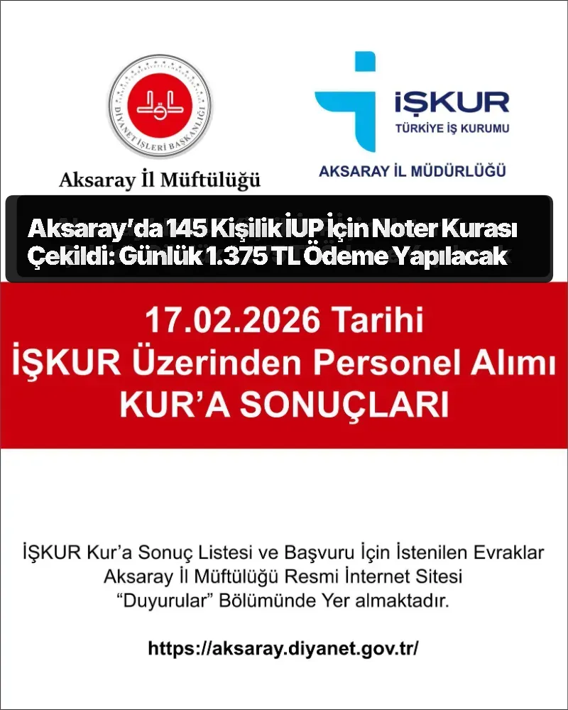 Aksaray’da Türkiye İş Kurumu (İŞKUR) ile Diyanet İşleri Başkanlığı iş birliğinde, Aksaray İl Müftülüğü bünyesinde yürütülecek 145 kişilik İşgücü Uyum Programı (İUP) için noter kurası gerçekleştirildi. Çalışma ve Sosyal Güvenlik Bakanlığı koordinasyonunda uygulanacak program kapsamında isimleri belirlenen katılımcılar yarı zamanlı olarak istihdam edilecek.