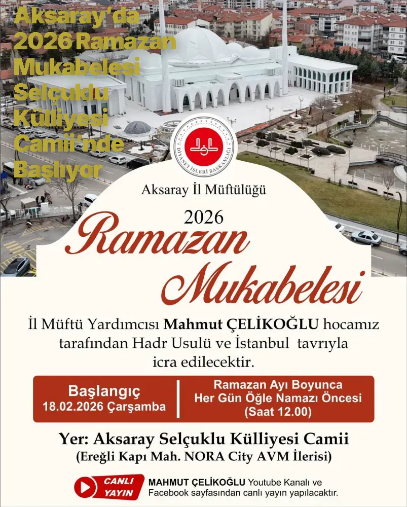 Aksaray İl Müftülüğü, 2026 yılı Ramazan ayı kapsamında düzenlenecek mukabele programını kamuoyuna duyurdu. Ramazan ayı boyunca gerçekleştirilecek mukabele programı, İl Müftü Yardımcısı Mahmut Çelikoğlu tarafından icra edilecek.