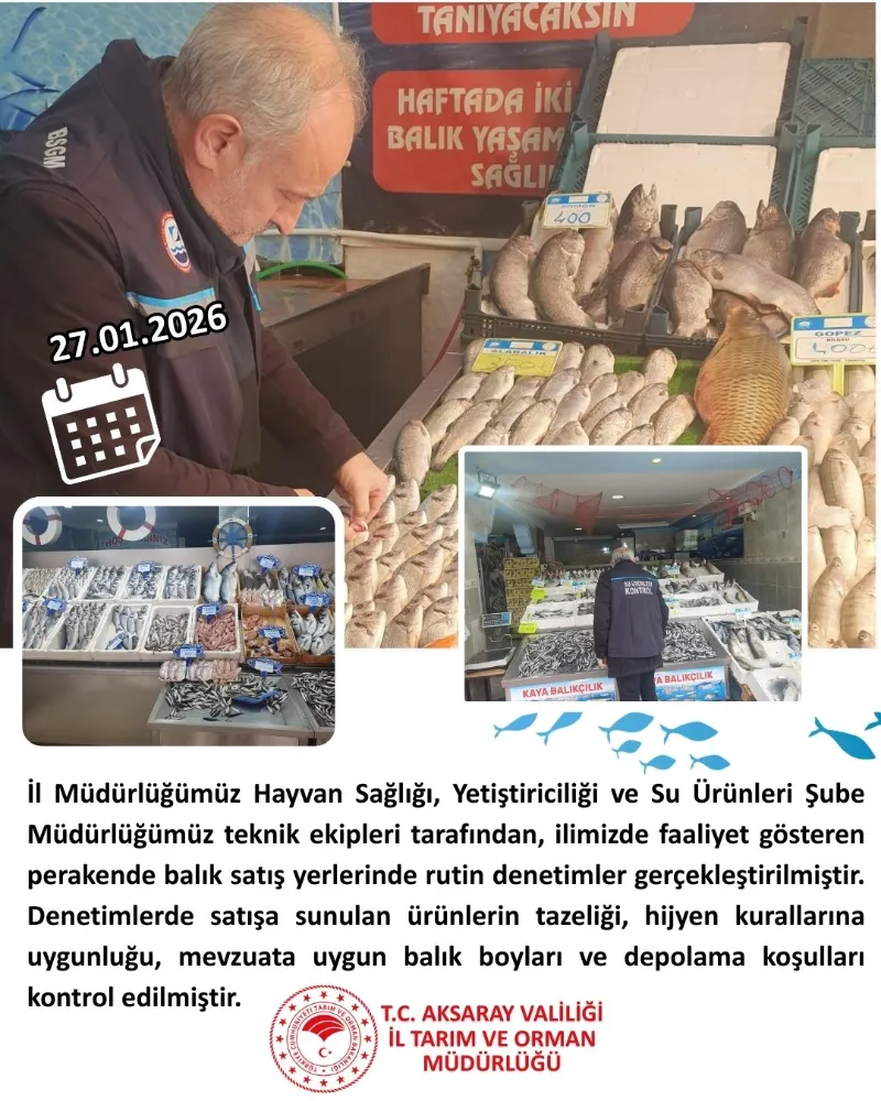 Aksaray İl Tarım ve Orman Müdürlüğü, halk sağlığının korunması ve güvenilir gıda arzının sağlanması amacıyla il genelinde faaliyet gösteren perakende balık satış noktalarına yönelik rutin denetimlerini sürdürdü.