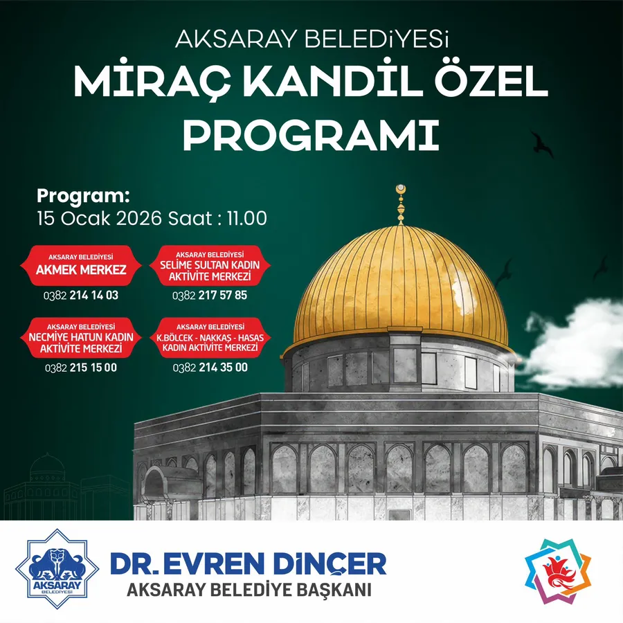 Aksaray Belediyesi, İslam âlemi için büyük anlam taşıyan Miraç Kandili dolayısıyla kadınlara yönelik özel bir program düzenliyor. Manevi değerlerin ön plana çıkarılacağı program, 15 Ocak Perşembe günü saat 11.00’de Aksaray genelindeki AKMEK merkezleri ile Kadın Aktivite Merkezinde gerçekleştirilecek.