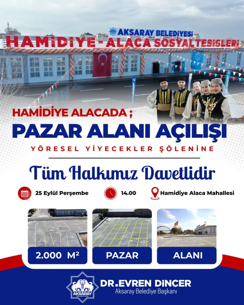 Aksaray Belediyesi tarafından hayata geçirilen yeni Pazar Yeri, görkemli bir açılış programıyla hizmete giriyor. Açılış töreni, Yöresel Yiyecekler Şöleni ile renklenecek. Belediye Başkanı Dr. Evren Dinçer’in de katılacağı etkinlikte, kültür ve dayanışmayı pekiştirecek çeşitli gösteriler ve ikramlar yer alacak.
