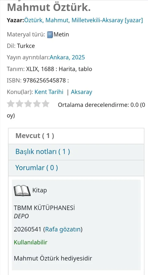 Ankara’da 2025 yılında yayımlanan eser, TBMM Kütüphanesi’ne yazar Mahmut Öztürk tarafından hediye edildi. Kent tarihi kategorisinde yer alan kitap, Meclis Kütüphanesi’nin depo bölümünde araştırmacıların kullanımına açık bulunuyor. ISBN numarasıyla resmî kayıtlara geçen çalışma, Aksaray’ın kültürel ve tarihsel mirasının ulusal düzeyde arşivlenmesi açısından da ayrı bir önem taşıyor.