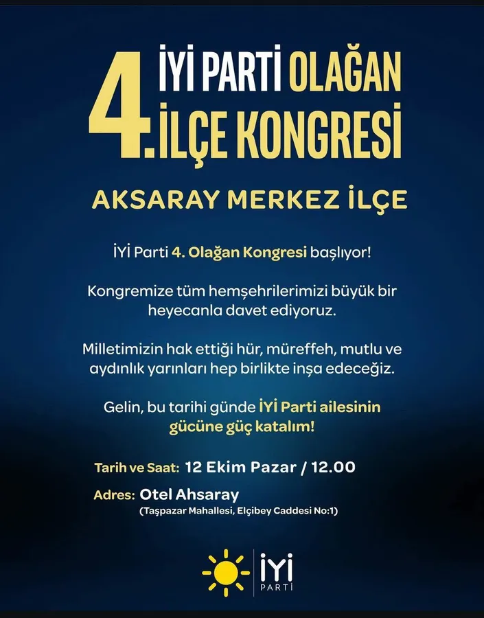 Parti tarafından yapılan duyuruda, kongreye tüm Aksaraylı hemşehrilerin büyük bir heyecanla davet edildiği belirtilerek, “Milletimizin hak ettiği hür, müreffeh, mutlu ve aydınlık yarınları hep birlikte inşa edeceğiz. Gelin, bu tarihi günde İYİ Parti ailesinin gücüne güç katalım.” ifadelerine yer verildi.