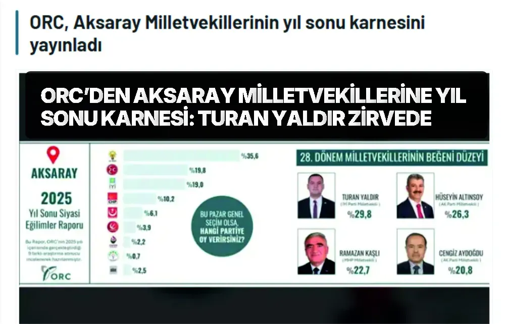 ORC Araştırma’nın 2025 yılı değerlendirmesinde Aksaray’ın en beğenilen milletvekili İYİ Parti’li Turan Yaldır olurken, AK Parti’den Hüseyin Altınsoy ikinci olurken, Kaşlı ve Aydoğdu oy ve beğeni oranlarındaki düşüş dikkat çekti.