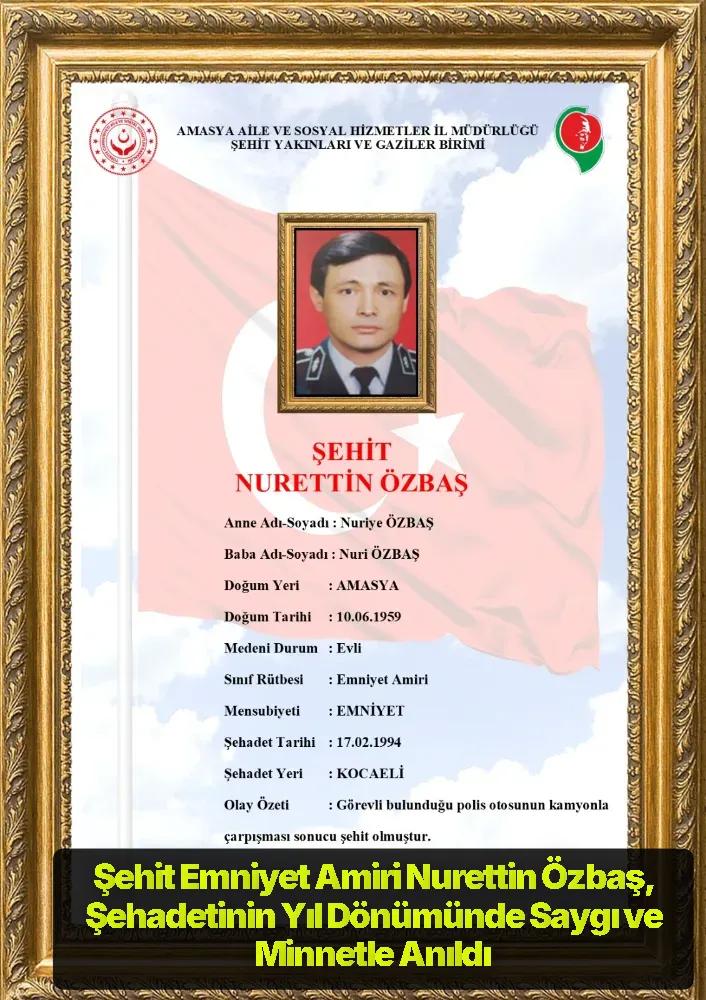 Şehit Emniyet Amiri Nurettin Özbaş’ın adı, Amasya Aile ve Sosyal Hizmetler İl Müdürlüğü’nün “Şehitlerimiz” listesinde yer alırken, fedakârlığı ve hizmetleri kamuoyunda saygıyla anılmaya devam ediyor.