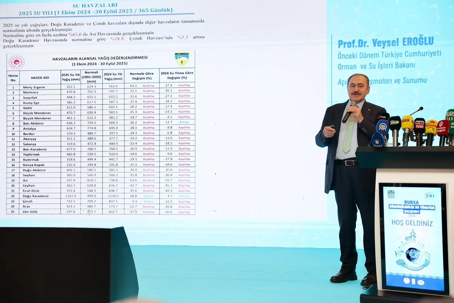 Bursa’yı çok sevdiğini ve şehir ile arasında gönül bağı olduğunu vurgulayan Orman ve Su İşleri eski Bakanı Veysel Eroğlu; “Evet bir iklim değişikliği ile karşı karşıyayız. Ancak doğru planlama yapılırsa ne Bursa’da ne de Türkiye’de herhangi bir su sorunu yaşanmaz. Yeşil Bursa’daki mevcut su yatırımlarının yüzde 90’ı bizim hükümetlerimiz döneminde gerçekleştirilmiştir. Sayın Cumhurbaşkanımızın da Bursa’da projelerin aksamaması için özel talimatı var. Dağdibi, Kocayayla, Ağlaşan Kayacık, Gözede, Yalıçiftlik, Çınarcık, Altıntaş, Karıncalı, Nilüfer, Boğazköy, Çiçeközü, Gökçesu barajları bizim dönemimizde Bursa’ya kazandırıldı. Bakınız 23 yılda Bursa’ya; 25 adet baraj, 12 adet HES, 54 adet sulama tesisi, 4 adet içme suyu tesisi, 27 adet taşkın önleme tesisi ve 5 adet arazi toplulaştırma projesi olmak üzere toplamda 152 adet tesis kazandırdık. Bu tesislerin yatırım maliyeti ise yaklaşık 76 milyar TL. Ancak bu yatırımlara rağmen Bursa’nın yaşadığı sıkıntılar ortada. Yakın vadede bu sorunu aşmak için Çınarcık barajı devreye alınmalıdır. Çınarcık Barajı’ndan su alınıp arıtma tesislerine taşınmalı. Bu su da Bursa’ya verilmelidir. Böylece Bursa’nın su sorunu kalmaz” ifadelerini kullandı.