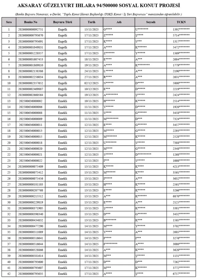 Proje kapsamında kasabamız için ayrılan 94 konutun kura çekilişine katılacak hak sahiplerinin isim listesi de kamuoyuyla paylaşıldı. Belirlenen listede yer alan vatandaşlar, kura günü yapılacak çekilişle birlikte ev sahibi olma şansı yakalayacak.