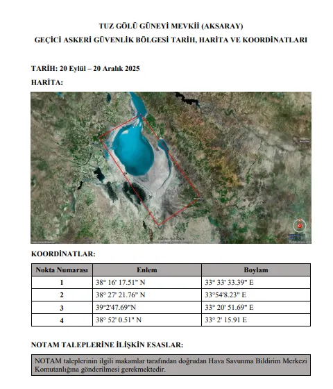 Aksaray’da bulunan Tuz Gölü Güneyi Mevkii, 20 Eylül – 20 Aralık 2025 tarihleri arasında Geçici Askerî Güvenlik Bölgesi ilan edildi. Valilikten yapılan duyuruda, bölgenin belirlenen tarihler arasında güvenlik açısından özel bir statüye kavuştuğu ve vatandaşların bu süre zarfında dikkatli olmaları gerektiği belirtildi.