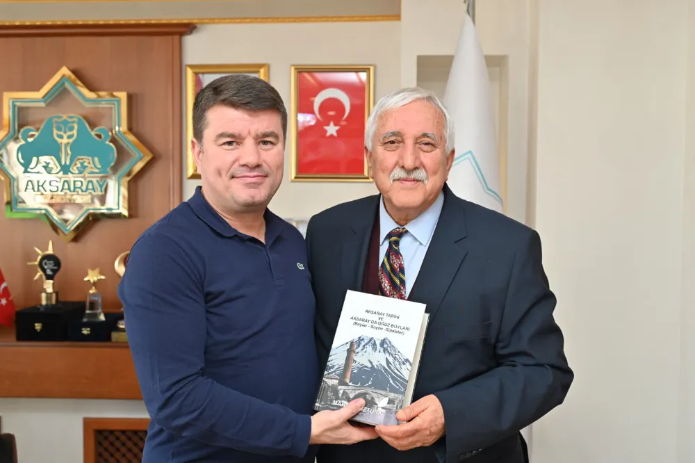 Ziyaret sırasında önceki dönem Milletvekili Mahmut Öztürk tarafından Belediye Başkanı Dr. Evren Dinçer’e, “Aksaray Tarihi ve Aksaray’da Oğuz Boyları” adlı kıymetli eser takdim edildi. Aksaray’ın tarihi ve kültürel köklerini ele alan bu anlamlı eser, şehrin belleğine ışık tutması açısından büyük önem taşıyor.