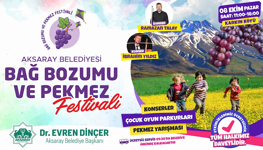 Aksaray Belediye Başkanı Evren Dinçer tarafından gerçekleştirilecek olan Bağ Bozumu ve Pekmez Festivali, yine Aksaray’lılara muhteşem bir festival günü yaşatacak. Vatandaşlar, festival alanına gitmek için şimdiden birbirleriyle 8 Mart Pazar günü buluşmak üzere randevulaştılar.