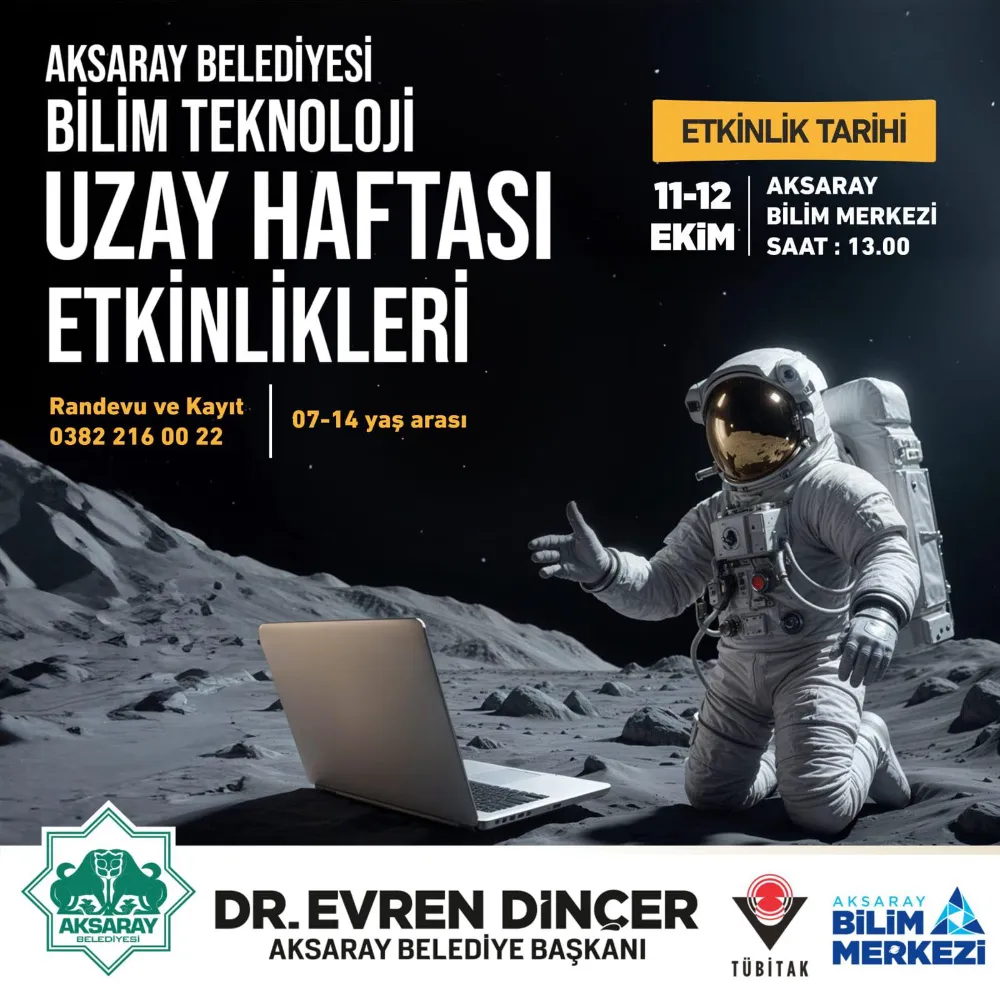 Aksaray Belediyesi, çocukların bilim ve teknolojiye olan ilgisini artırmak amacıyla “Bilim, Teknoloji ve Uzay Haftası Etkinlikleri”ni hayata geçiriyor. 7-14 yaş arası çocuklara yönelik düzenlenecek etkinliklerde, minik katılımcılar gökyüzünü keşfedecek, uzay bilimine dair keyifli ve öğretici deneyimler yaşayacak.